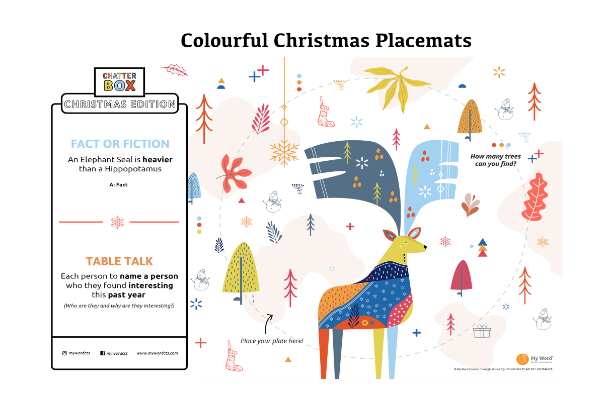 Our unique Christmas Placemats come in packs of 12, each containing a different conversation starter and fun table challenge, a great way to engage the entire family!
